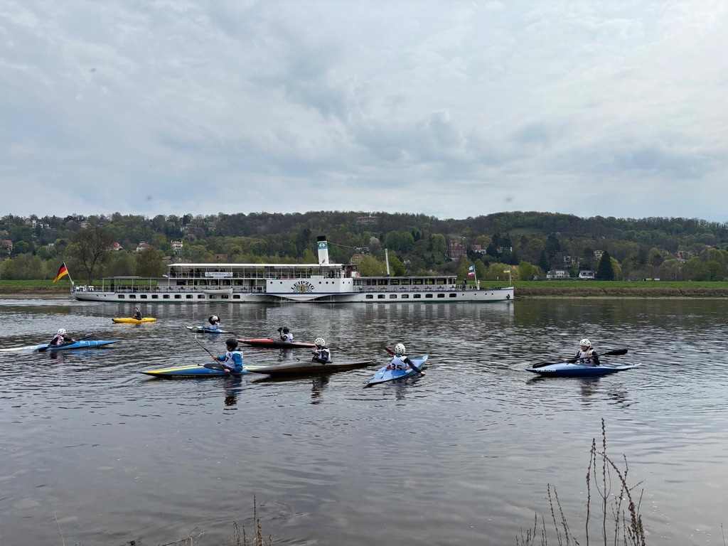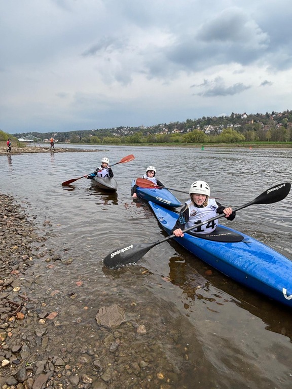 Während in Spremberg angepaddelt wurde, waren die Jüngsten Slalomkinder zum Wettkampf in Dresden. Dort erlebten sie einen gut organisierten Wettkampf auf der Elbe, wo es beim Paddeln um Pontons (auf den die Tore installiert sind) und vor allem bei Wellenschlag durch die Elbschifffahrt, einige Tücken und Schwierigkeiten gab. Gewitter war zwar angesagt, allerdings hielt das Wetter über die Wettbewerbe. Während der Siegerehrung kam doch noch der Regenguss.